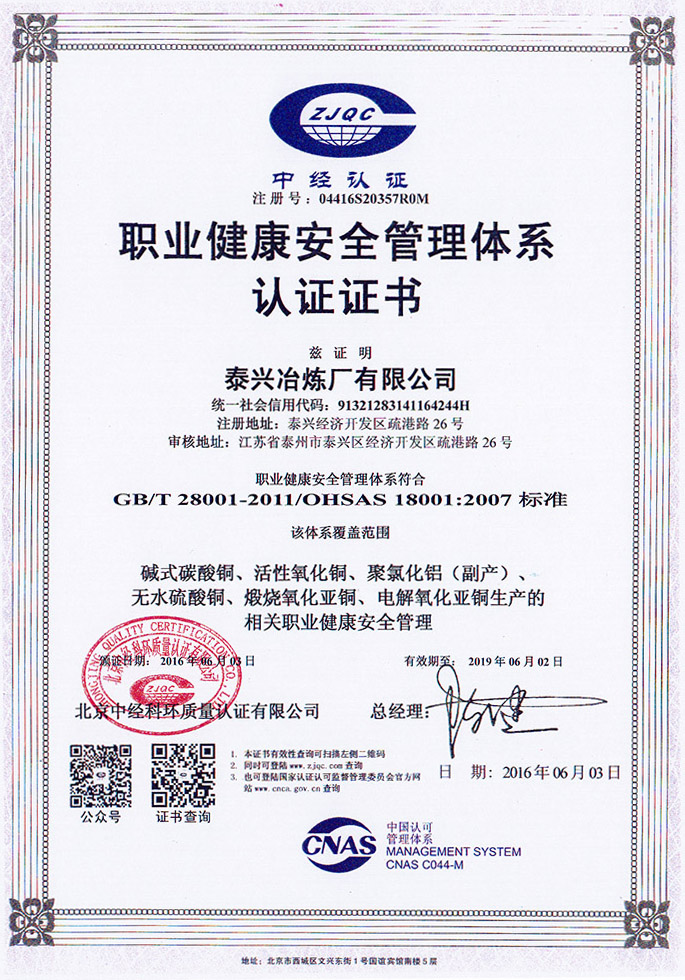 OHSAS18000 Occupational Health and Safety Management System Certificate
